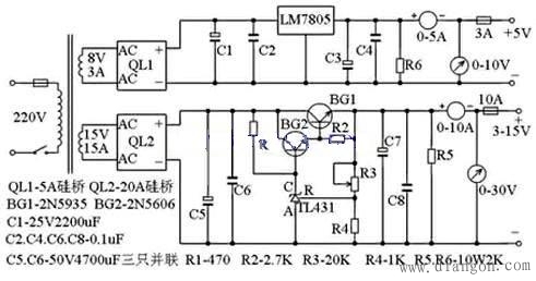 其工作原理分两部分,第一部分是一路固定的5V1.5A稳压电源电路。第二部分是另一路由3至15V连续可调的高精度大电流稳压电路。第一路的电路非常简单,由变压器次级8V交流电压通过硅桥QL1整流后的直流电压经C1电解电容滤波后,再由5V三端稳压块LM7805不用作任何调整就可在输出端产生固定的5V1A稳压电源,这个电源在检修电脑板时完全可以当作内部电源使用。第二部分与普通串联型稳压电源基本相同,所不同的是使用了具有温度补偿特性的,高精度的标准电压源集成电路TL431,所以使电路简化,成本降低,而稳压性能却很高。图中电阻R4,稳压管TL431,电位器R3组成一个连续可调得恒压源,为BG2基极提供基准电压,稳压管TL431的稳压值连续可调,这个稳压值决定了稳压电源的最大输出电压,如果你想把可调电压范围扩大,可以改变R4 和R3的电阻值,当然变压器的次级电压也要提高。变压器的功率可根据输出电流灵活掌握,次级电压15V左右。桥式整流用的整流管QL用15-20A硅桥,结构紧凑,中间有固定螺丝,可以直接固定在机壳的铝板上,有利散热。调整管用的是大电流NPN型金属壳硅管,由于它的发热量很大,如果机箱允许,尽量购买大的散热片,扩大散热面积,如果不需要大电流,也可以换用功率小一点的硅管,这样可以做的体积小一些。滤波用50V4700uF电解电容C5和C7分别用三只并联,使大电流输出更稳定,另外这个电容要买体积相对大一点的,那些体积较小的同样标注50V4700uF尽量不用,当遇到电压波动频繁,或长时间不用,容易失效。最后再说一下电源变压器,如果没有能力自己绕制,有买不到现成的,可以买一块现成的200W以上的开关电源代替变压器,这样稳压性能还可进一步提高,制作成本却差不太多,其它电子元件无特殊要求,安装完成后不用太大调整就可正常工作。