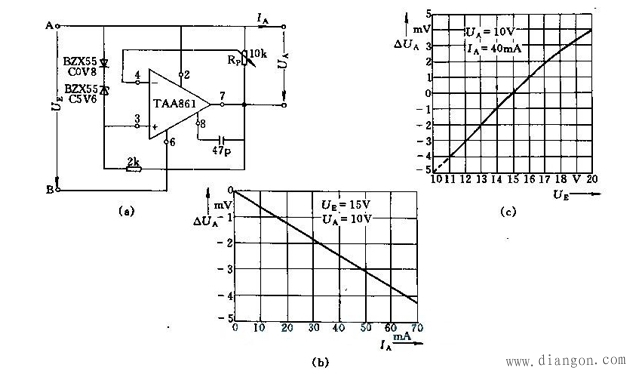 图(a)电路输出电压由电位器Rp调节,并且具有线性调节特性。图(b)示出输出电压偏差Ua同负载电流Ia(0-70mA)的关系曲线,图(c)为同输入电压Ue的关系曲线。