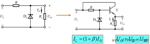 稳压原理:电路引入电压负反馈,稳定输出电压。 串联型稳压电路的基本组成及其作用 调整管:是电路的核心,UCE随UI和负载产生变化以稳定UO。 基准电压:是UO的参考电压。 取样电阻:对UO的取样,与基准电压共同决定UO。 比较放大:将UO的取样电压与基准电压比较后放大,决定电路的稳压性能。