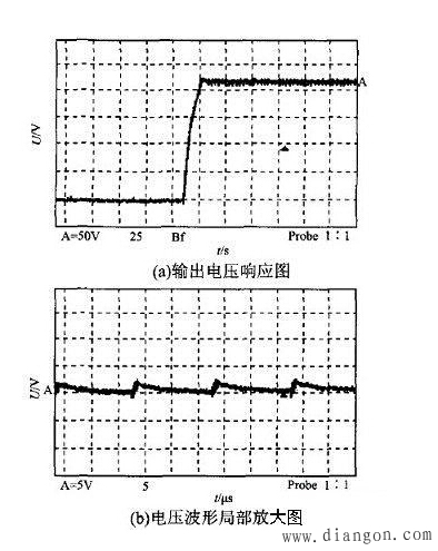 所得试验样机额定负载时的输出波形如图4(a)所示。由图4(a)实际读数可知,输出电压从0上升到220V的响应时间为1s左右,电源系统具有较快的响应速度。同时,由图4(b)中的电压波形局部放大图可见,输出电压为220V时,电压波动在2V左右,其最大电压波动小于1%.
