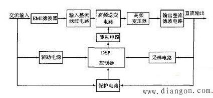 本文所设计的开关电源的基本组成原理框图如图1所示,主要由功率主电路、DSP控制回路以及其它辅助电路组成。