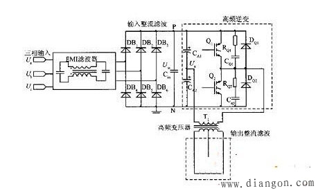 本电源功率主回路采用“AC-DC-AC―DC”变换的结构,主要由输入电网EMI滤波器、输人整流滤波电路、高频逆变电路、高频变压器、输出整流滤波电路等几部分组成,如图2所示。