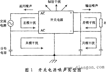 如图1所示,电网中含有的共模和差模噪声对开关电源产生干扰,开关电源在受到电磁干扰的同时也对电网其他设备以及负载产生电磁干扰,例如返回噪声、输出噪声和辐射干扰等。进行开关电源EMI/EMC设计时,一方面要防止开关电源对电网和附近的电子设备产生干扰;另一方面要加强开关电源本身对电磁干扰环境的适应能力。下面用等效电路分别介绍共模和差模干扰产生的原因及路径。