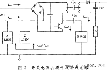 如图2所示,当开关管转为“关”时,集电极与发射极间的电压快速上升达500 V,他产生的电流经集电极与地之间的分布电容返回整流桥,这个按开关频率工作的脉冲串电流是共模噪声。这个电压会引起共模电流Icm2向CP2充电和共模电流Icm1向CP1充电,其中CP1为变压器初、次级之间的分布电容,CP2为开关电源与散热器之间的分布电容(即开关管集电极与地之间的分布电容)。则线路中共模电流总大小为Icm1+Icm2。如图3所示,当开关管转为“开”时,储能电容Cs的能量由AC电网和整流桥提供,他被开关管变换器的快速开关频率所变换,并通过变压器形成脉冲电流IL,他具有非常丰富的开关频率谐波。储能电容不是一个纯电容,他有串联电阻和电感。当整流桥处开关管“开”时,在AC电网端,IL会产生一个由电容的L,R,C所呈现的阻抗电压,这就是开关电源产生差模发射源的原理。差模电流Idm和信号电流IL沿着导线、变压器初级、开关管组成的回路流通。