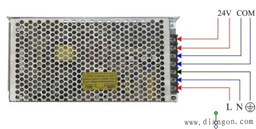 开关电源(Switching Mode Power Supply),是一种高频化电能转换装置。其功能是将一种形式的电能转换为另一种形式的电能。如图所示开关电源的右边接点中,下面的三个接点接电源的输入端220V交流电的L、N和接地;上面的四个点分别是两个24V接点和2个公共端接点,在接线操作中可以分别引出两组24V直流电压供电。