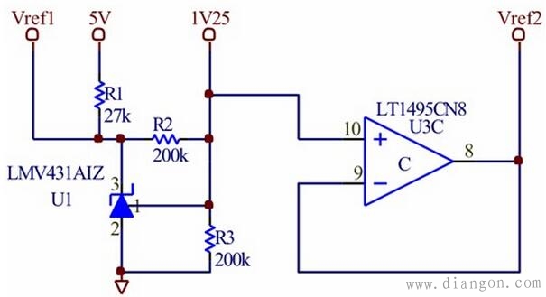U1/U3C电路产生两个参考电压Vref1和Vref2。其中Vref1是用于控制信号Vw的参考电压。Vref2则匹配UUT的1.25V参考电压。