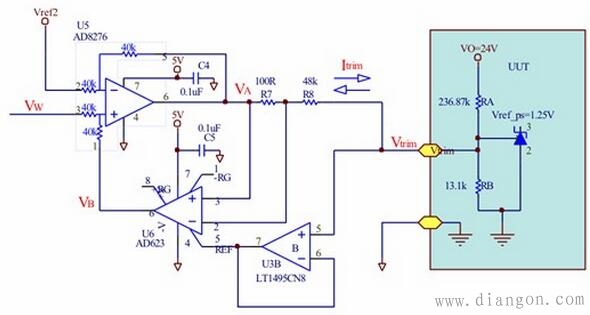 差分放大器U5产生Itrim并用以调节VO的幅度,通过使电流流入Vtrim节点来降低VO,或吸入电流来提升VO。U6是一个增益等于1的仪表放大器,用于将检测到的电流反馈给U5。