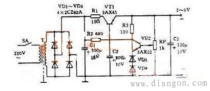 图3 实用的稳压电源 图3是一个实用的稳压电源。输出电压3~9伏可调,输出电流最大100毫安。这个电路就是串联型稳压电源电路。要注意的是: ①整流桥的画法和图2(c)不同,实际上它就是桥式整流电路。 ②这个电路使用PNP型锗管,所以输出是负电压,正极接地。 ③用两个普通二极管代替稳压管。任何二极管的正向压降都是基本不变的,因此可用二极管代替稳压管。2AP型二极管的正向压降约是0.3伏,2CP型约是0.7伏,2CZ型约是1伏。图中用了两个2CZ二极管作基准电压。 ④取样电阻是一个电位器,所以输出电压是可调的。 能够把微弱的信号放大的电路叫做放大电路或放大器。例如助听器里的关键部件就是一个放大器。 可以看到,想要毫无障碍的阅读电路图并快速理解其中的内容,是需要一定的方式方法的。首先需要按照“整流、滤波、稳压”的顺序来进行大致的梳理,而后再进行各部分的细分,最终将整张图的内容进行串联。在最后,本文利用生活中几个常见的电路图进行举例来帮助大家进行理解。 |