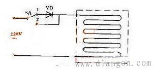 图1 电热毯电路 图1是一个电热毯电路。开关在“1”的位置是低温档。220伏市电经二极管后接到电热毯,因为是半波整流,电热毯两端所加的是约100伏的脉动直流电,发热不高,所以是保温或低温状态。开关扳到“2”的位置,220伏市电直接接到电热毯上,所以是高温档。