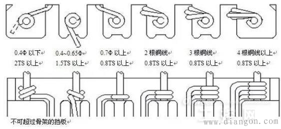 ②出入线于使用,骨架的凹槽出线时,原则上以一线一凹槽方式出线,若同一引脚有多组可使用同一凹槽或相邻的凹槽出线,唯在焊锡及装套管时要注意避免短路。