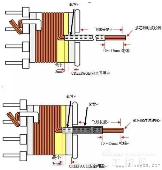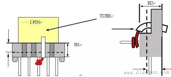 ④变压器中有加铁氟龙套且有折回线时,其出入线所加之铁氟龙套管须与骨架的凹槽口齐平(或至少达2/3高),并自骨架的凹槽出线以防止因套管过长造成拉力将线扯断。但若为L形引脚水平方向缠线,则套管应与骨架边齐平(或至少2/3长),如图7所示。