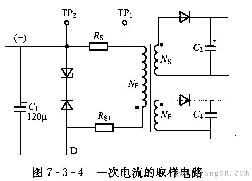 有时,为了观测高频变压器初级一次绕组的电流波形,还可以在一次绕组串联取样电阻。一次回路电流的取样电路如图7-3-4所示,这时的测量状态就是之前文章谈到的“浮动”测量。理论上讲,取样电阻串联在初级一次绕组上端或者下端都可以;实际上,如果串联在一次绕组下端,见图中Rs1位置,测量时会在示波器接地线上产生浮动的高压脉冲。这样做既不安全,也会产生较大的测量干扰和误差,还可能影响开关电源的正常工作。正确的方法是将取样电阻串联在一次绕组上端,见图Rs位置,并且要在TP1端连接示波器探头的信号线,在TP2端连接探头的接地夹子。这样,虽然一次回路电路波形是反极性的,但测量时的干扰和误差是最小的,对开关电源的正常工作没有影响。可以通过示波器的反极性(INV)功能按钮,观看到正极性的一次电流波形。