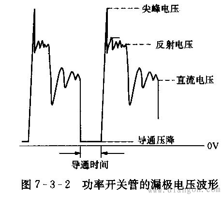 从TP1可以看到功率开关管的漏极电压波形,这个波形能够反映出漏极尖峰电压、输入直流高压、二次反射电压、开关管导通压降及导通与截止时间等信息。在单端反激式开关电源中,功率开关管的漏极电压波形如图7-3-2所示。
