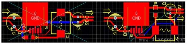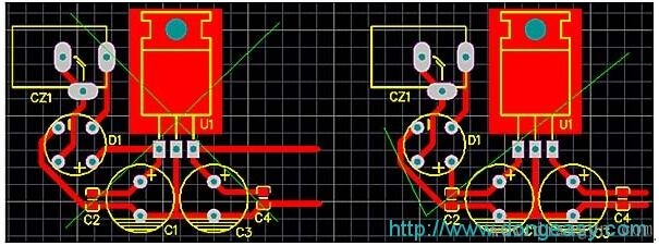 PCB设计时,元件的布局要紧凑,要让所有的连线尽可能短,要按原理图元件功能关系去布局元件与走线。本电源图里就是先整流、再滤波、滤波后才是稳压、稳压后才是储能电容、流经电容后才给后面的电路用电。图二是上面原理图的PCB图,两个图相似。左图和右图就是走线有点不一样,左图的电源经整流后直接就到了稳压芯片的输入脚了,然后才是稳压电容,这里电容所起的滤波效果就差了很多,输出也有问题。右图就是比较好的图了。我们不仅要考虑正电源的流向问题,还必须考虑地回流问题,一般来说,正电源线和地回流线要尽可能同进同出,彼此离近点。