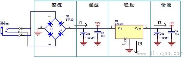 从图上可知,线性电源有整流、滤波、稳压、储能等功能元件组成,同时,一般用的线性电源为串联稳压电源,输出电流等于输入电流,I1=I2+I3,I3是参考端,电流很小,因此I1≈I3。我们为什么要讲电流,是因为PCB设计时,每条线的宽度不是随便设的,是要根据原理图里元件节点间的电流大小来确定的(请查《PCB设计铜铂厚度、线宽和电流关系表》)。电流大小、电流流向要搞清楚,做板才恰到好处。