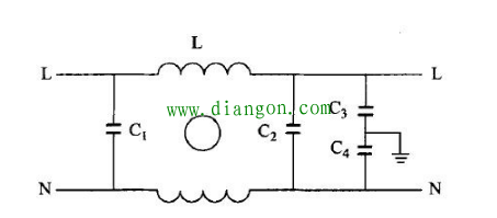 交流电源输人线上存在以上两种干扰,通常为低频段差模干扰和高频段共模干扰。在一般情况下差模干扰幅度小、频率低、造成的干扰小;共模干扰幅度大、频率高,还可以通过导线产生辐射,造成的干扰较大。若在交流电源输人端采用适当的EMI滤波器,则可有效地抑制电磁干扰。电源线EMI滤波器基本原理如图1所示,其中差模电容C1、C2用来短路差模干扰电流,而中间连线接地电容C3、C4则用来短路共模干扰电流。共模扼流圈是由两股等粗并且按同方向绕制在一个磁芯上的线圈组成。如果两个线圈之间的磁藕合非常紧密,那么漏感就会很小,在电源线频率范围内差