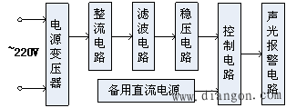 (2) 电网正常供电时,通过电源变压器降压后经整流、滤波及稳压得报警器所需直流电压,为防止电网停电,在控制器的输入端设置有备用电源,保证报警器在停电时能正常工作。