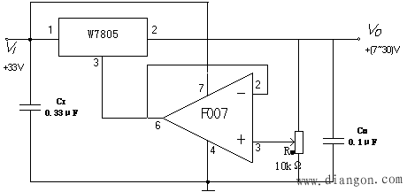 电路由集成稳压器W7805和运算放大器F007等元器件构成,F007作为电压跟随器用,调节电位器RW可改变VO的稳压值。由于运放的输出幅度和稳压器输出电流的限值,故使输出电压VO的调节范围为(7~30)V。