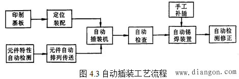 自动装配工艺流程:对于设计稳定,产量大和装配工作量大而元器件又无需选配的产品,宜采用自动装配方式。自动插装工艺流程框图如图4.3所示。
