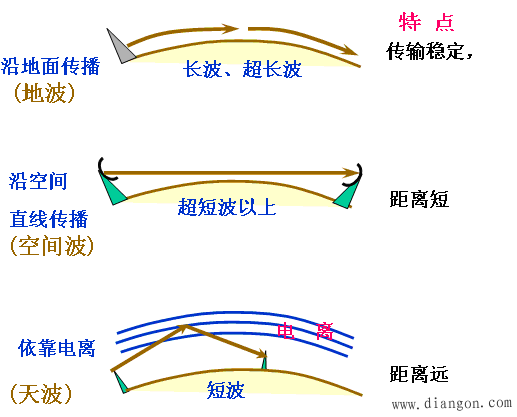 无线电传播方式大体可分为三种:沿地面传输、沿空间直线传播和依靠电离层传播。其传播的示意图以及特点如图所示。