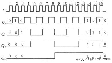 可见,在第16个时钟脉冲到来后,计数器循环一周回到原态,因此也称为十六进制计数器。其波形图如图5所示,由图可知,各触发器输出端Q0,Q1,Q2,Q3的脉冲频率分别为时钟脉冲的1/2,l/4,l/8,1/16,也称分频器。