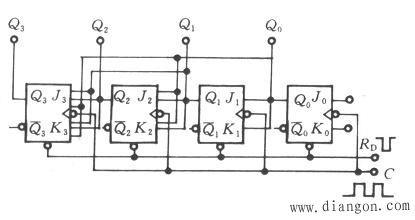 (b)同步二进制加法计数器:异步二进制计数器线路简单,工作速度较慢。同步计数器工作速度较快,电路较复杂。图6所示为同步4位二进制加法计数器的逻辑电路图。从图中可以看出计数脉冲同时供给各触发器,它们的状态变换和计数脉冲同步。图中每个触发器有多个J端和K端,各J端或各K端之间都是“与”逻辑关系。