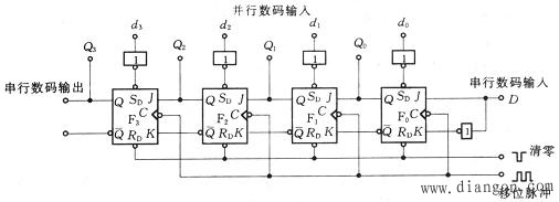 图2所示是由J―K触发器组成的4位左移移位寄存器。F0接成D触发器,数码由D端串行输入;也可由d0~d3作并行输入。从4个触发器的Q端得到并行的数码输出。也可从Q3端逐位串行输出。
