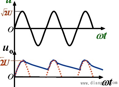 若v2处于正半周,二极管D1、D3导通,变压器次端电压v2给电容器C充电。此时C相当于并联在v2上,所以输出波形同v2 ,是正弦波。 当v2到达wt=p/2时,开始下降。先假设二极管关断,电容C就要以指数规律向负载RL放电。指数放电起始点的放电速率很大。在刚过wt=p/2时,正弦曲线下降的速率很慢。所以刚过wt=p/2时二极管仍然导通。在超过wt=p/2后的某个点,正弦曲线下降的速率越来越快,当刚超过指数曲线起始放电速率时,二极管关断。所以在t2到t3时刻,二极管导电,C充电,Vi=Vo按正弦规律变化;t1到t2时刻二极管关断,Vi=Vo按指数曲线下降,放电时间常数为RLC。电容滤波过程见图2。
