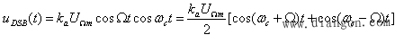 由图1(b)可看出调幅波由三个频率分量组成,即载波分量ωc,上边频ωc+Ω,下边频ωc+Ω ,其带宽为: 若调制信号是多频信号,设最高频率为 ,则带宽为: 通常将调幅波电压加在电阻R端,电阻R消耗的各频率分量对应的功率表示为: 载波平均功率为: 两个边频分量产生的平均功率相等,为: 调幅信号总平均功率为: 故调幅波的输出功率随Ma的增大而增大。当 Ma=1时,包含信息的上下边频功率值之和只占总输出功率的1/3,其能量利用率很低。 2、抑制载波的双边带调幅信号(DSB) 因为载波本身并不包含信息,而且还占有较大的功率,为了减小不必要的功率浪费,可以只发射边频,而不发射载波,称为抑制载波的双边带调幅信号,用DSB表示。其数学表示式为 。 DSB信号的波形和频谱图如图2(a)、(b)所示。 图2 DSB信号的时域波形以及频谱结构