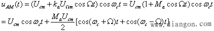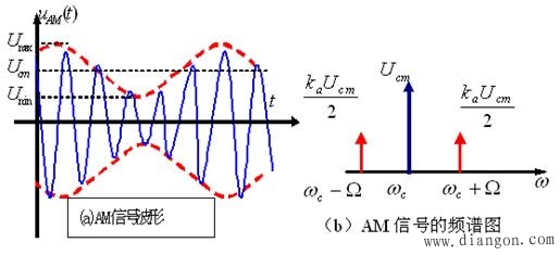 用待传输的低频信号去改变高频载波振幅的过程,称为振幅调制,简称调幅,有普通调幅(AM)、抑制载波的双边带调幅(DSB)和抑制载波的单边带调幅(SSB)三种。 1、普通调幅(AM) 设调制信号为单频信号,即: 载波信号为: 则普通调幅信号的表达式为: 其中,m称为调幅系数,其值介于0与1之间。当m>1时,产生过调失真。AM调幅信号波的波形和频谱图分别如图11(a)、(b)所示。 图1 AM信号的波形和频谱