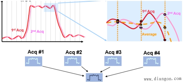 通过对多次采集的波形的相同时刻采样点进行平均计算,这样可以有效降低高斯白噪声的影响,减少毛刺,光滑波形,使得波形尽量接近真实。需要注意的是:该算法是对相同时间上的采集点(可认为是数据)进行平均计算,而不是对波形多次平均。其局限在于:仅在信号很相近且触发位置连续稳定时才能正常工作。示意图如下所示: