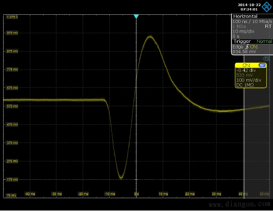 测试低频信号时,示波器的带宽太大,就会从环境中引入跟多的高频噪声。示波器为1G带宽,对带宽不加限制,直接测量该几百赫兹的信号,会发现很多噪声毛刺,见图1。这样可以考虑把示波器带宽设为20MHz,再去测量波形上的毛刺明显减少,见图2。