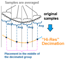 当被测信号的波形符合一定特点时,可以采用分辨率增强模式来获得更高的等效采样率,这样可以提高被测信号的准确度。其特点为:示波器按固定的时间间隔进行采样:触发一次后,示波器对电压进行连续的等时间间隔采样,然后根据采样点重建信号波形。实时采样模式用来捕获非重复性或单次信号。在实时采样模式下,可以设置采样抽取(Decimation)模式减少样本数。下图所示为HighRes工作模式: