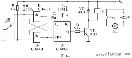 (2)大多数数字电路图是以数字电路为主、由外围元器件和模拟电路等共同组成。例如图1-2所示为数字延时开关电路,电路包括与非门D1、D2、单稳态触发器D3等数字电路,还包括晶体管VT1、二极管VD1、电阻R1~R4、按钮开关SB、继电器K1等元器件。