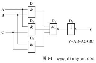 1.电路图 电路图是关于电路的图纸。电路图由各种符号和线条按照 一定的规则组合而成,用抽象的符号反映出电路的结构与工作 原理。通过电路图,我们可以详细了解电子设备的电路结构、工作原理和接线方法,还可以进行定量的计算分析和研究。 2.数字电路图 数字电路图是关于数字电路的图纸。数字电路图由各种逻辑符号、元器件符号和绘图符号按照一定的规则组合而成,反映出数字电路或以数字电路为主的电路的结构、逻辑关系与工作原理。 (1)数字电路图可以全部由数字电路构成。例如图1-1所示为多数表决电路的电路图,由与门(D1、D2、D3)、或非门(D4)、非门(D5)等数字逻辑电路组成。