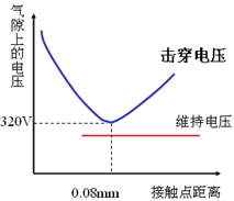 起辉电压:能够造成气体电离的电压称为起辉电压。起辉电压与气体种类、气体压力和触点之间距离有关。标准压力和温度下的空气,当触点间距是0.08mm时,起辉电压大约为320V。触点间距增加或减小时,电压都要增加。