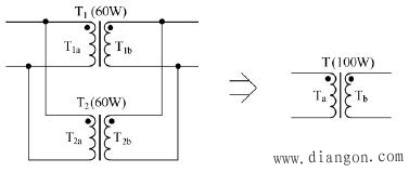 当一个电源变压器的额定功率不能满足要求时,可以用两个或两个以上相同的电源变压器并联使用,以获得较大输出功率。例如,缺少100W的电源变压器,可以用两个60W、次级绕组均符合要求的变压器并联代用,如图6所示。两个较小功率变压器的效率比一个较大功率变压器的效率要低一些,因此,并联的两个变压器的功率之和,应稍大于需要的功率值。