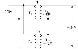 (3)两个电源变压器次级绕组正向串联提高输出电压。如图3所示,电源变压器T1、T2输出电压均为12V,将它们的初级并联接入220V电源,它们的次级正向串联后即可获得24V的输出电压。连接中须注意识别各绕组的同名端,不能接错。