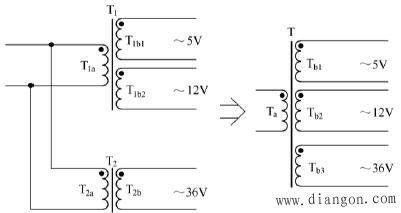 当电源变压器的次级绕组数量不足时,可以同时使用两个或更多电源变压器。图7示例中,两个电源变压器T1、T2同时使用,可以等效为一个次级多绕组变压器T。T1、T2所有的次级绕组都是等效变压器T的次级绕组。