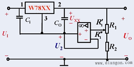集成稳压器的规格种类繁多,具体电路也有差异,最简单的是三端固定式输出集成稳压器,它只有三个引线端:输入端(接整流滤波电路的输出),输出端(接负载)和公共地端。 常用的有两个系列,78××系列为正输出,79××系列为负输出,“××”代表输出电压值,有5V、6V、8 V、9V、10V、12V、15V、18V、24V等,输出电流有0.1A(78L××、79L××)、0.5A (78M××、79M××)和1.5A(78××、79××)3种。 如W78M15表示输出电压为+15V、输出电流为0.5A。W79M15表示输出电压为-15V、输出电流为0.5A。 三端稳压器的外形图如下图所示。 1、三端集成稳压器的应用 (1)单电源稳压电路 W7800系列三端集成稳压器的接线图如下图所示,图中使用的W7805的输出电压为+5V。 (2)双电源稳压电路 同时输出正、负电压的稳压电路如下图所示。图中使用W7815和W7915,则输出电压为±15V。 (3)输出电压可调的稳压电路 在下图所示电路中,  ,而  为W78XX固定输出电压,调节电位器 R1即可改变  ,便实现了输出电压可调。 2、使用时要注意的问题 ① 为了防止自激振荡,在输入端一般要接一个0.1~0.33μF 的电容 Ci。 ② 为了消除高频噪声和改善输出的瞬态特性,即在负载电流变化时不致引起 Uo有较大波动,输出端要接一个1μF以上的电容 Co。 ③ 为了保证输出电压的稳定,输入、输出间的电压差应大于2V。但也不应太大,太大会引起三端稳压器功耗增大而发热,一般取3~5V。 ④ 除W7824(W7924)的最大输入电压为40V外,其它稳压器的最大输入电压为35V。 ⑤ 尽管三端稳压器有过载保护,为了增大其输出电流,外部要加散热片。 |
