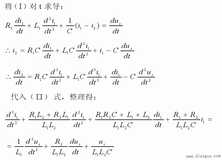 由以上分析可得结论:对于一般的动态电路,运用基尔霍夫定律,总可以得到一个单未知量的输入输出方程。电路越复杂,动态元件越多,得到的微分方程的阶数越高。