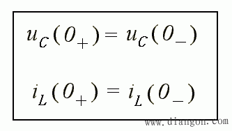 显然,在 t=0 之前,电路是一种状态,在 t=0 之后,电路是另一种状态。我们规定:t=0- 表示换路前的时刻,它与 t=0 时刻的间隔趋于 0 ; t=0+ 表示换路后的时刻,它与 t=0 时刻的间隔也趋于 0 。 因此,初始条件可表示成: