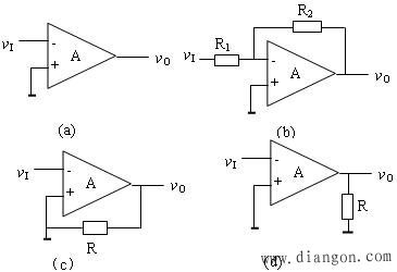如在图1(a)所示电路中,集成运放的输出端与同相输入端、反相输入端均无通路,故电路中没有引入反馈。在图(b) 所示电路中,电阻R2将集成运放的输出端与反相输入端相连接,因而集成运放的净输入量不仅决定于输入信号,还与输出信号有关,所以该电路中引入了反馈。在图(c) 所示电路中,虽然电阻R跨接在集成运放的输出端与同相输入端之间,但是由于同相输入端接地,所以R只不过是集成运放的负载,等效于(d)电路,而不会使vO作用于输入回路,可见电路中没有引入反馈。