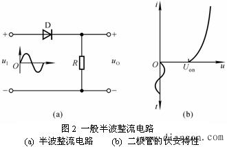 在图2(a)所示为一般半波整流电路,由于二极管的伏安特性如图(b)所示,当输入电压uI幅值小于二极管的开启电压Uon时,二极管在信号的整个周期均处于截止状态,输出电压始终为零。即使uI幅值足够大,输出电压也只反映uI大于Uon的那部分电压的大小。在uI与Uon相差不大时,输出整流波形在零区附近的失真非常明显。因此,该电路不能对微弱信号整流。