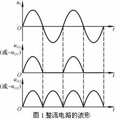 当输入电压为正弦波时,半波整流电路的输出电压波形如图1中uO1所示,全波整流电路的输出电压波形如图1中uO2所示。