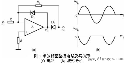 图3(a)所示为半波精密整流电路。当uI>0时,必然使集成运放的输出