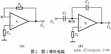 再例如,在图1(b)所示电路中,当信号频率趋于零时,C1、C2、C3相当于开路,N点是虚地,等效电路如图所示,输出电压