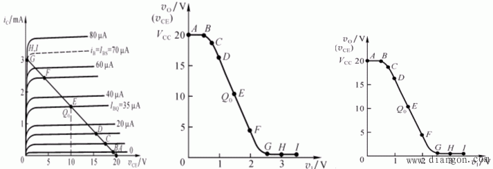 作为放大应用时:Q点应置于E处(放大区中心)。若Q点设置C处,易引起载止失真。若Q点设置F处,易引起饱和失真。