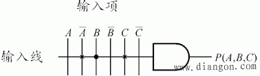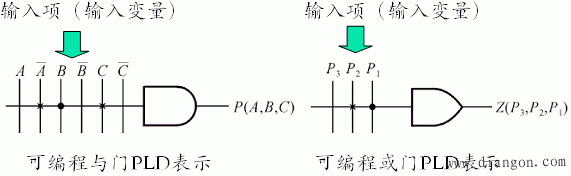 。说明它有8种编程状态,产生8种或项。通常,可编程与门的输入变量可多达几十个,或门阵列的输入变量有八个以上。为了方便,这时的逻辑表示方法用下面的PLD表示法。