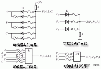 如何实现编程:对与阵,只需将和二极管正极端连的熔丝接地,然后加上编程电压(电源5V时,编程电压为25V),此时,相应熔丝将流过比正常电流大得多的电流而被熔断,其它保留。对或阵,将和二极管负极端连的熔丝接正电源,将熔丝熔断。